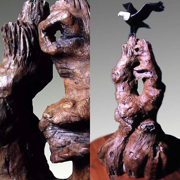 Eagle Perch was made from three different types of stone. The tree stump is carved from one piece of Brazilian soapstone, and is designed to look like an eagle with its wings up in the air. The eagle itself has a head of alabaster overlaid on top of a body of "Wonder Stone", with the alabaster tail inlaid to give the look of overlapping feathers.